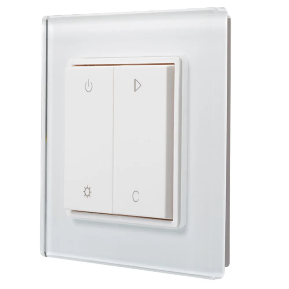 Накладная многофункциональная 2-х клавишная RGBW панель (1 зона). Питание - литиевая батарейка 3V CR2430. Управляет контроллером SR-1009xx по радиоканалу. Размер 86х86х14 мм
