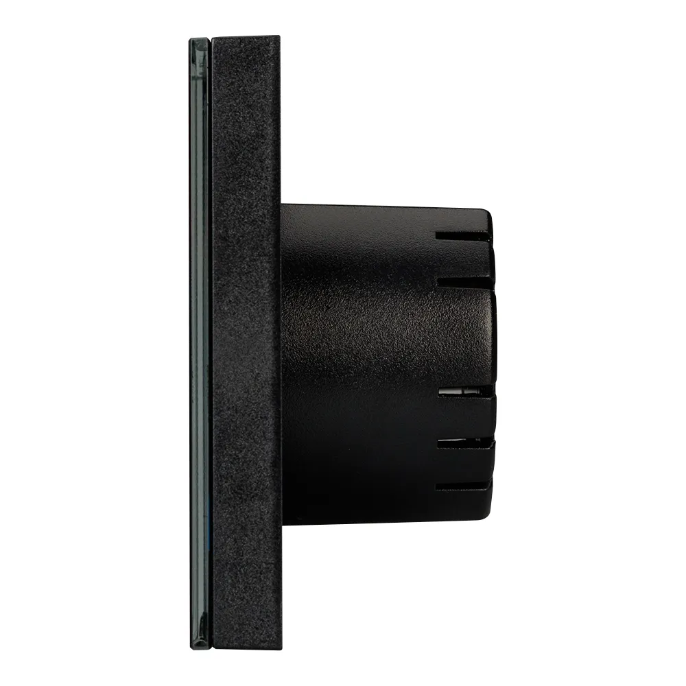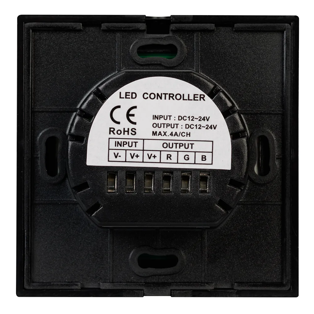 Встраиваемая стеклянная панель (Европейский стандарт), цвет черный, RGB контроллер, сенсорное кольцо Touch, выбор 64 цветов. Питание 12-24V, макс.ток 3x4A. Габариты 80х80х42 мм