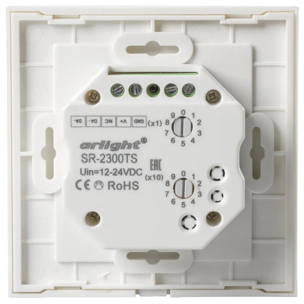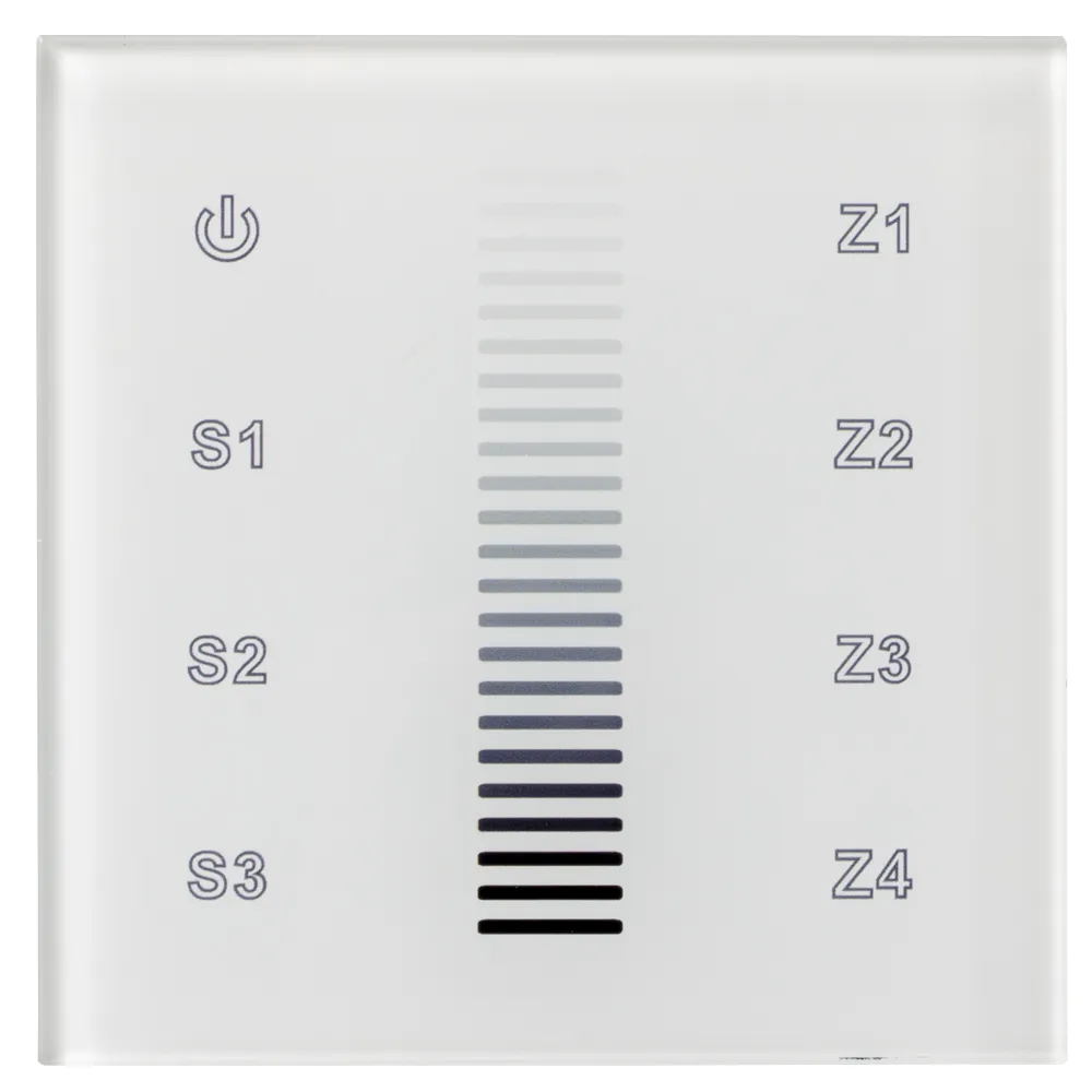Встраиваемая сенсорная панель с выходом DALI. Управление 4-мя зонами. Каждая зона = 1 адрес DALI. Адреса расположены последовательно (например, 01, 02, 03, 04). Установка адресов управления выполняется переключателями на корпусе. Питание DC 12-24В. Индикация состояния светодиодами на панели. Сохранение 3-х пользовательских настроек.