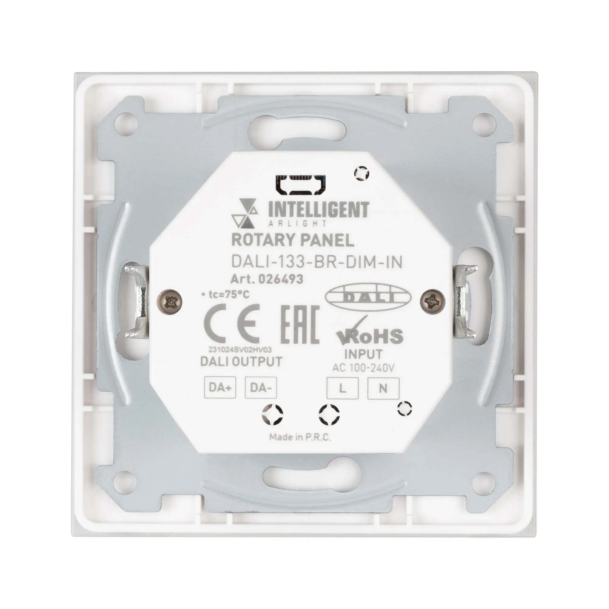 Встраиваемая роторная панель с выходом DALI. Установки адреса нет (Broadcast). Питание 100-240 VAC, встроенный источник тока для DALI-линии (выход 125 mA). До 32 устройств DALI. Настраиваемый режим ограничения минимальной яркости.