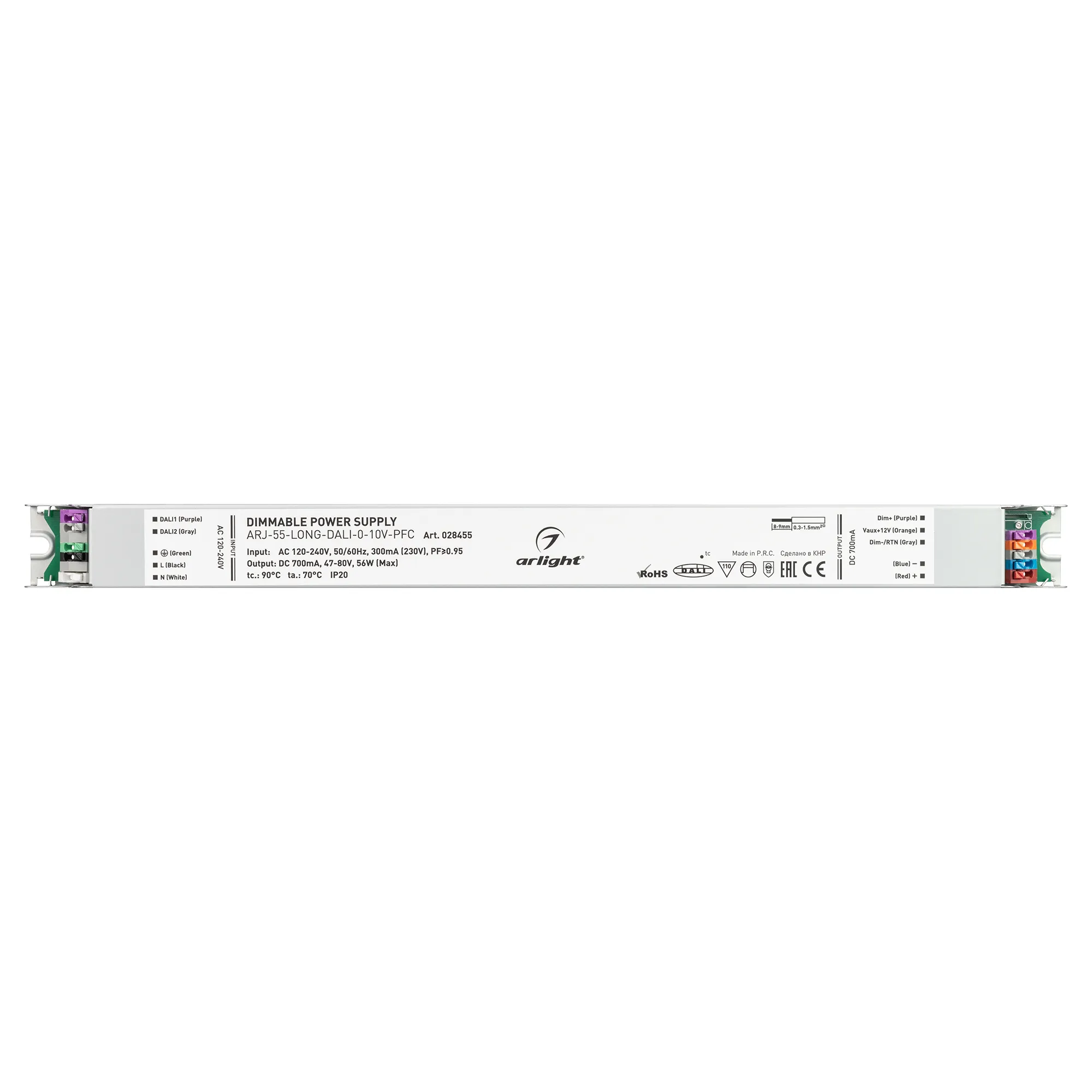 Диммируемый источник тока по протоколу DALI, стандарту 0-10 В с гальванической развязкой для светильников и мощных светодиодов. Входное напряжение 120-240 VAC. Выходные параметры: 47-80В (700мА), максимальная мощность 56 Вт. Встроенный PFC >0.95. Негерметичный алюминиевый корпус IP 20. Габаритные размеры длина 378 мм, ширина 30 мм, высота 21 мм. Гарантийный срок 7 лет.