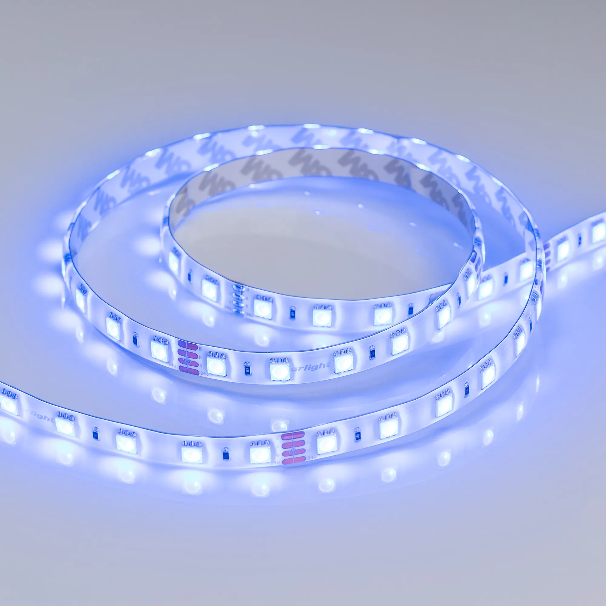Мультицветная светодиодная герметичная лента RTW серии B60, IP65 (SE - силиконовый верхний слой). Светодиоды SMD 5060, 60 шт/м, белая плата шириной 10 мм, скотч 3M. Цвет RGB, угол 120°. Питание 24 В, мощность 14.4 Вт/м (72 Вт на 5 м). Размеры 5000x10x2.7 мм. Мин. отрезок 100 мм, 6 светодиодов. Цена за 1 м.