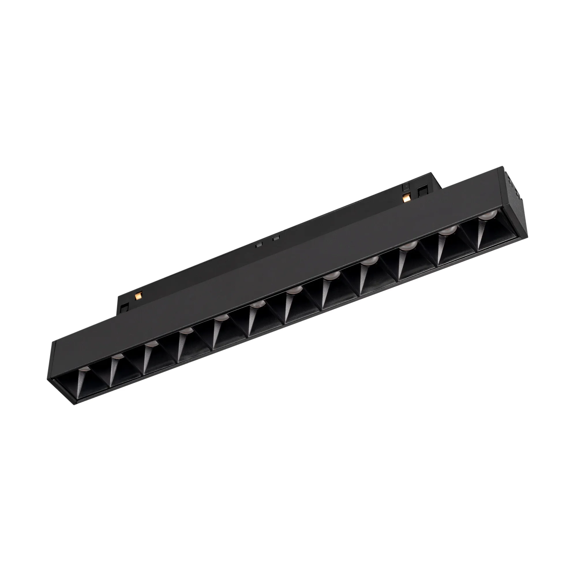 Светильник для магнитных треков MAG-ORIENT шириной 26 мм. Мощность 8 Вт, св. поток 440 лм, 55 лм/Вт, теплый 3000 K, CRI>90, угол24°, напряжение питания 48 В. Черный прямоугольный корпус из металла, экран поликарбонат, степень защиты IP20. Размер: длина 235 мм, ширина 22 мм, высота 42 мм. Монтаж на трек MAG-ORIENT. Пульсация <1%.