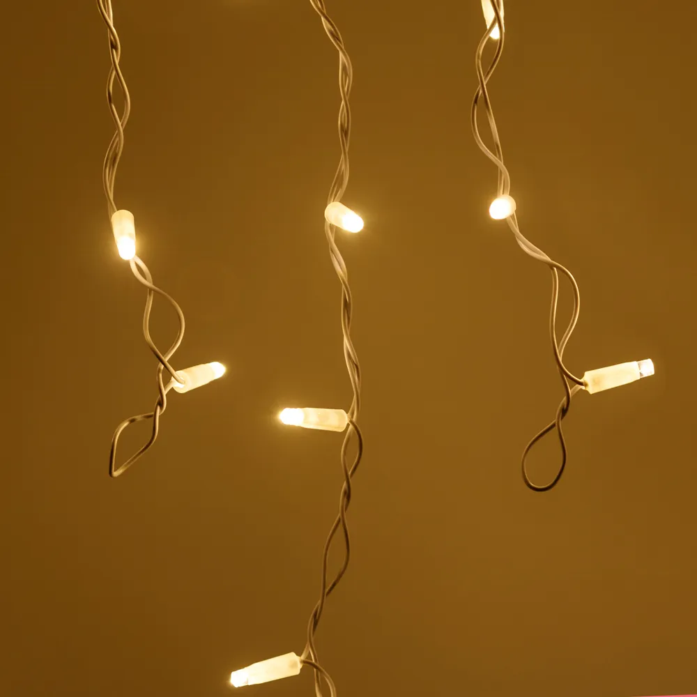 Светодиодная бахрома Pro. Размер 5600x900 мм (длина 5600 мм, по длине 48 нитей высотой 200/900 мм). Количество светодиодов 240 шт размером 7 мм. Цвет свечения ТЕПЛЫЙ БЕЛЫЙ (3000 К), эффект постоянного свечения с мягким световым рисунком (выпуклая молочно-белая линза). Провод белый, резиновый. Питание 230 В, Мощность 15 Вт, защита IP65, применение на улице под навесом. Аксессуары для подключения приобретаются отдельно.