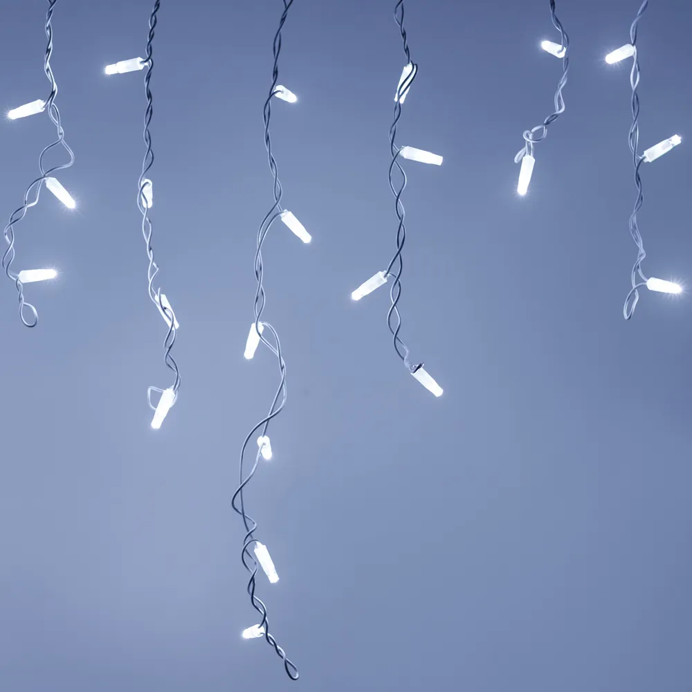 Светодиодная бахрома Classic. Размер 2400 мм (длина 2400 мм, по длине 24 нити высотой 200/600 мм). Количество светодиодов 88 шт размером 7 мм. Основной цвет свечения БЕЛЫЙ (6000 К), эффект мерцания редких точек (БЕЛЫЙ 6000К) с мягким световым рисунком (выпуклая молочно-белая линза), соотношение светодиодов: 66 белых постоянного свечения / 12 белых с мерцанием. Провод белый, ПВХ. Питание 230 В, Мощность 6 Вт, защита IP65, применение на улице под навесом. Аксессуары для подключения приобретаются отдельно.