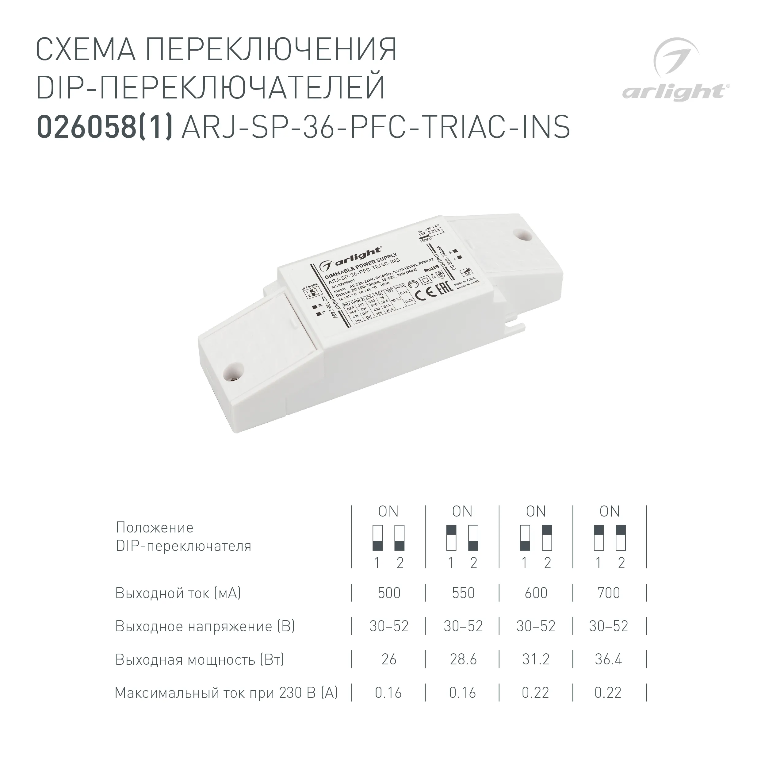 Блок питания ARJ-SP-36-PFC-TRIAC-INS (36W, 30-52V, 0.5-0.7A) (Arlight, IP20 Пластик, 5 лет)