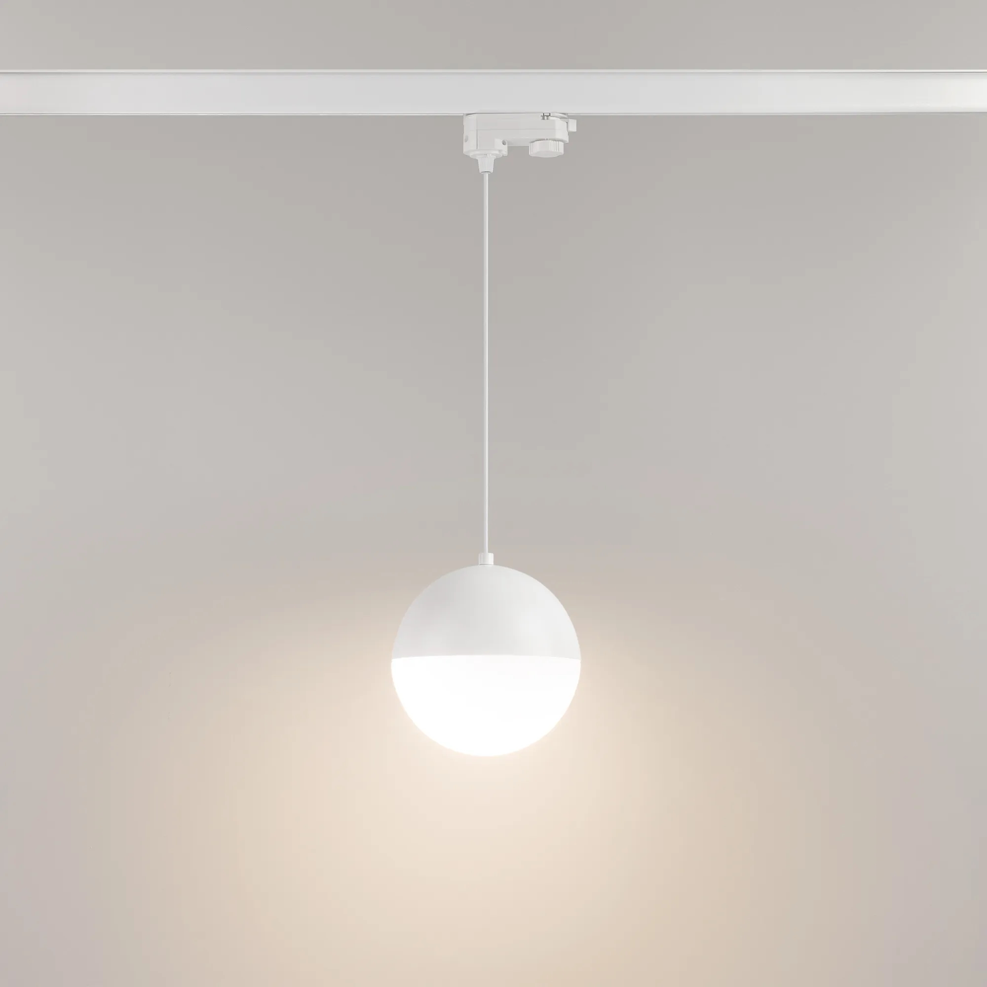 Светильник для треков/шин 4 провода. Мощность 11 Вт, св. поток 960 лм, 80 лм/Вт, теплый 3000 K, CRI>90, угол 170°, напряжение питания 230 В. Белый корпус из алюминия, материал плафона стекло, степень защиты IP20. Размер: диаметр 150 мм, длина подвеса 1500 мм. Монтаж на трек 3-фазный. Драйвер 28-42 В, 250 мА, пульсация <1%.