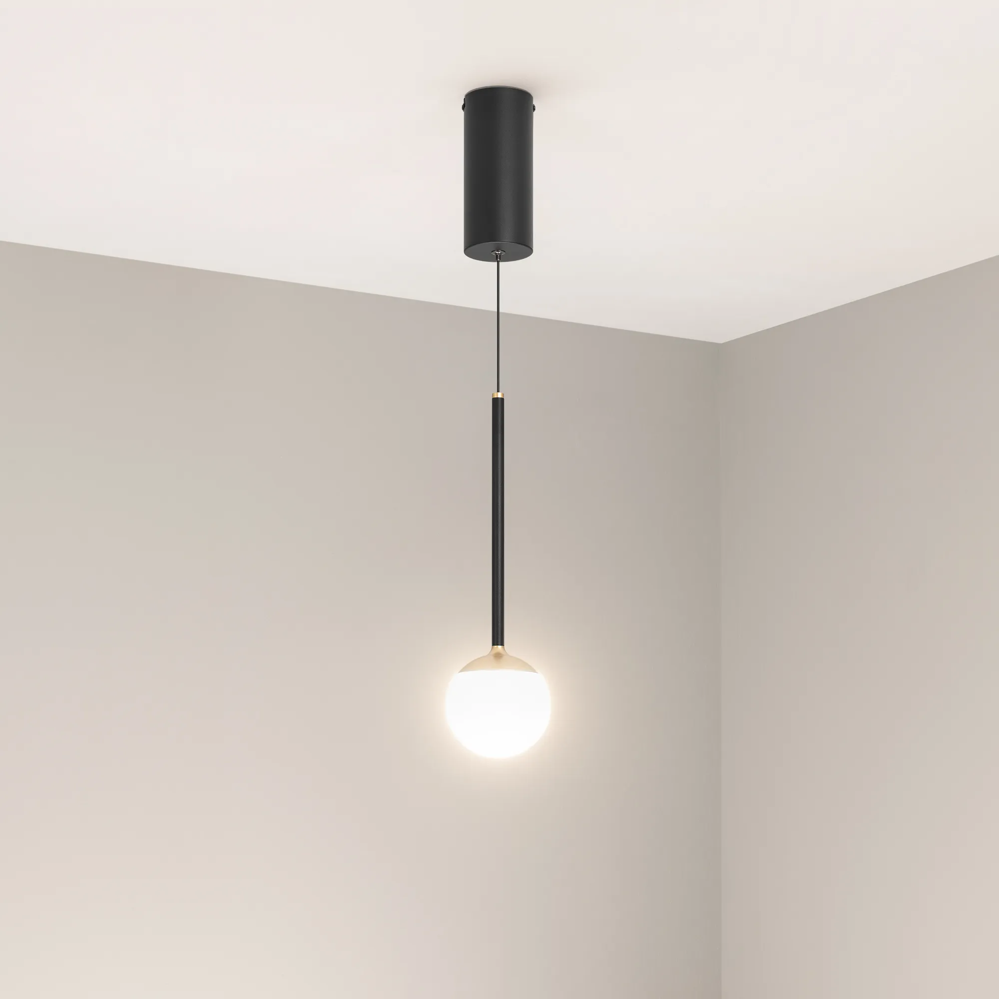 Подвесной светильник. Мощность 8 Вт, св. поток 620 лм, 80 лм/Вт, дневной 4000 K, CRI>90, угол 180°, напряжение питания 230 В. Черно-золотой круглый корпус из алюминия и стали, рассеиватель акрил, степень защиты IP20. Размер: диаметр 100 мм, высота ножки 244 мм, высота с плафоном 351 мм, размер чаши: диаметр 70 мм, высота 160 мм. Монтаж подвесной, длина подвеса 1150 мм. Драйвер 13-24 В, 300 мА, пульсация <1%.