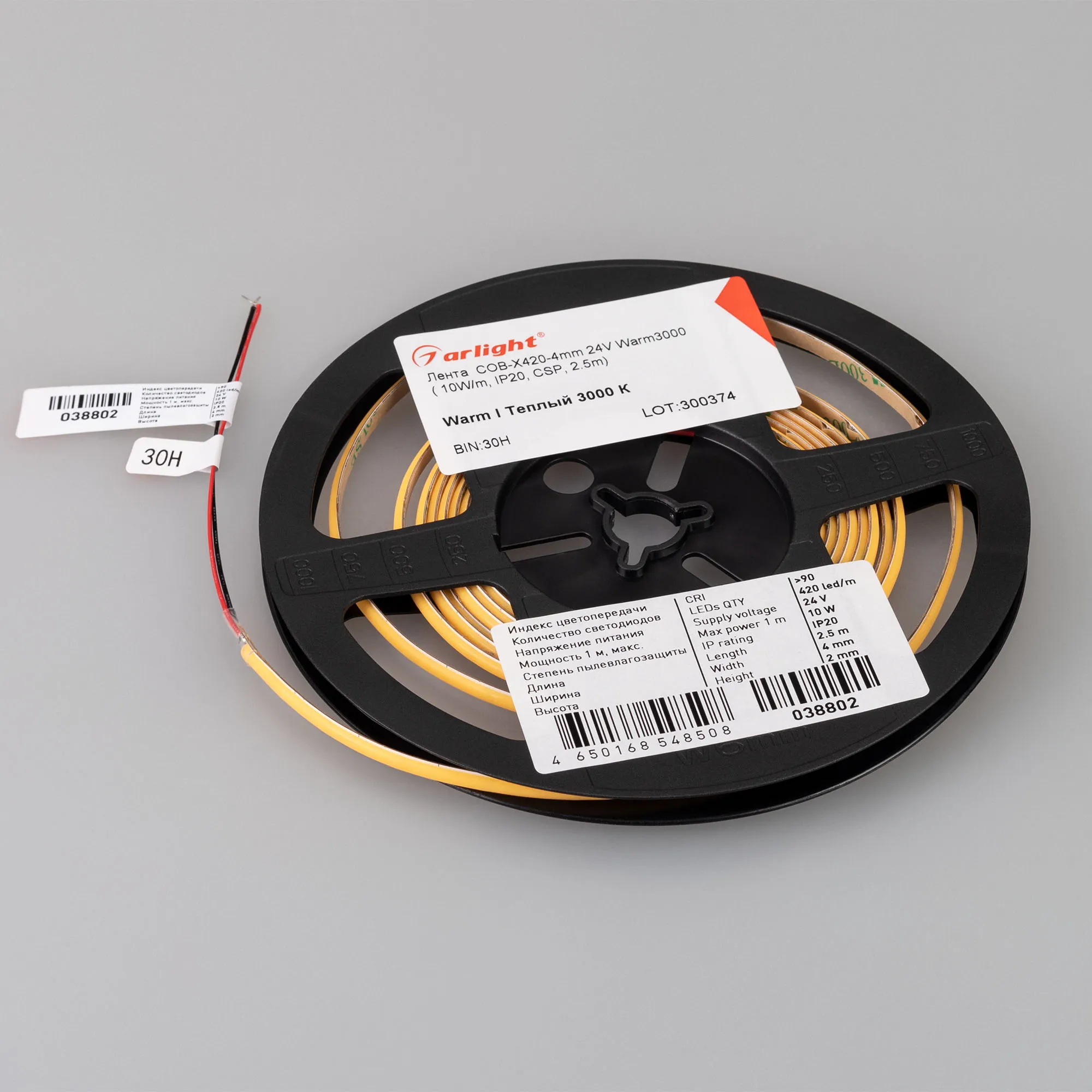 Лента светодиодная COB-X420-4mm 24V Warm3000 (10 W/m, IP20, CSP, 2.5m) (Arlight, узкая)