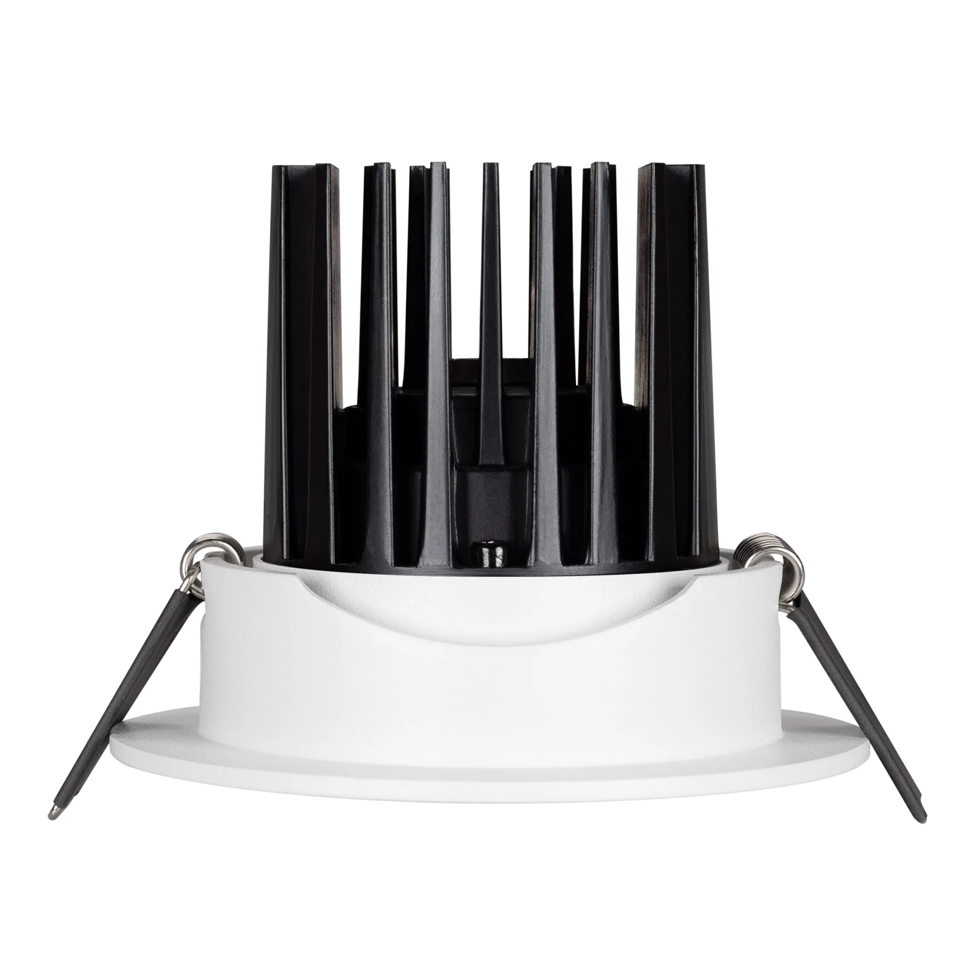 Встраиваемый поворотный светильник даунлайт. Мощность 10 Вт, св. поток 910 лм, 90 лм/Вт, дневной 4000 K, CRI>90, угол 36°, напряжение питания 230 В. Белый круглый корпус из алюминия, экран PMMA, степень защиты IP54. Размер: диаметр 94 мм, высота 75 мм. Монтаж встраиваемый, установочное отверстие: диаметр 77 мм. Драйвер IP54, 20-40 В, 250 мА, пульсация <1%.