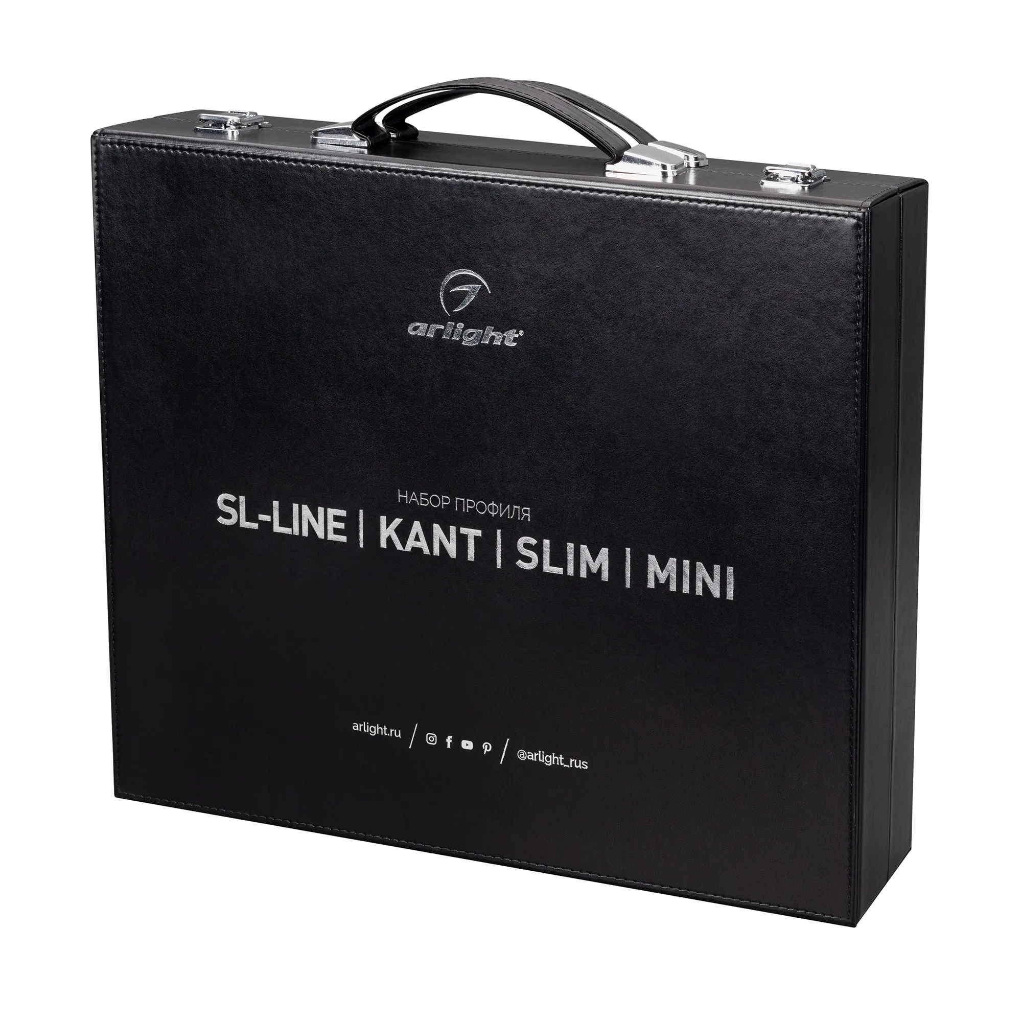 Демонстрационный набор обновлённых профилей серий SL-LINE-2011, SL-KANT-H16/H30, SL-SLIM/SLIM20, SL-MINI-8. Включает отрезки профиля с экраном и заглушками по 20см со светодиодной лентой 24В. Также в комплекте блок питания.