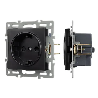 Механизм розетки с заземлением 1 пост, с суппортом из алюминия. Цвет - черный. Степень пылевлагозащиты - IP20.