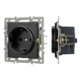 Механизм розетки с заземлением на 1 пост, с суппортом из алюминия. Цвет - черный. Степень пылевлагозащиты - IP20.