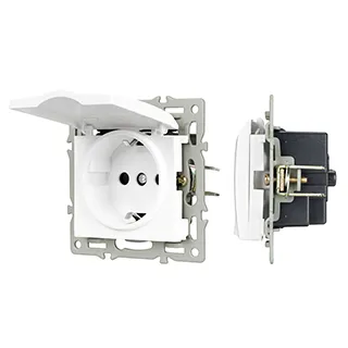 Механизм розетки с заземлением на 1 пост с влагозащитной крышкой, с суппортом из алюминия. Цвет - белый. Степень пылевлагозащиты - IP44.