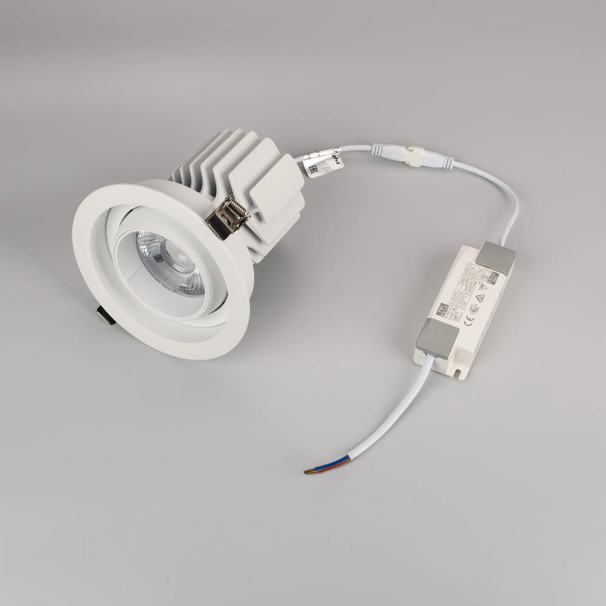 Встраиваемый карданный светильник. Мощность 30 Вт, св. поток 3260 лм, 106 лм/Вт, тёплый 3000 K, CRI>92, угол 30°, напряжение питания 230 В. Белый корпус из алюминия, белая вставка, степень защиты IP20. Размер: диаметр 135 мм, высота 125 мм. Монтаж встраиваемый, установочное отверстие: диаметр 120 мм. Драйвер 24-42 В, 750 мА, пульсация <2%.