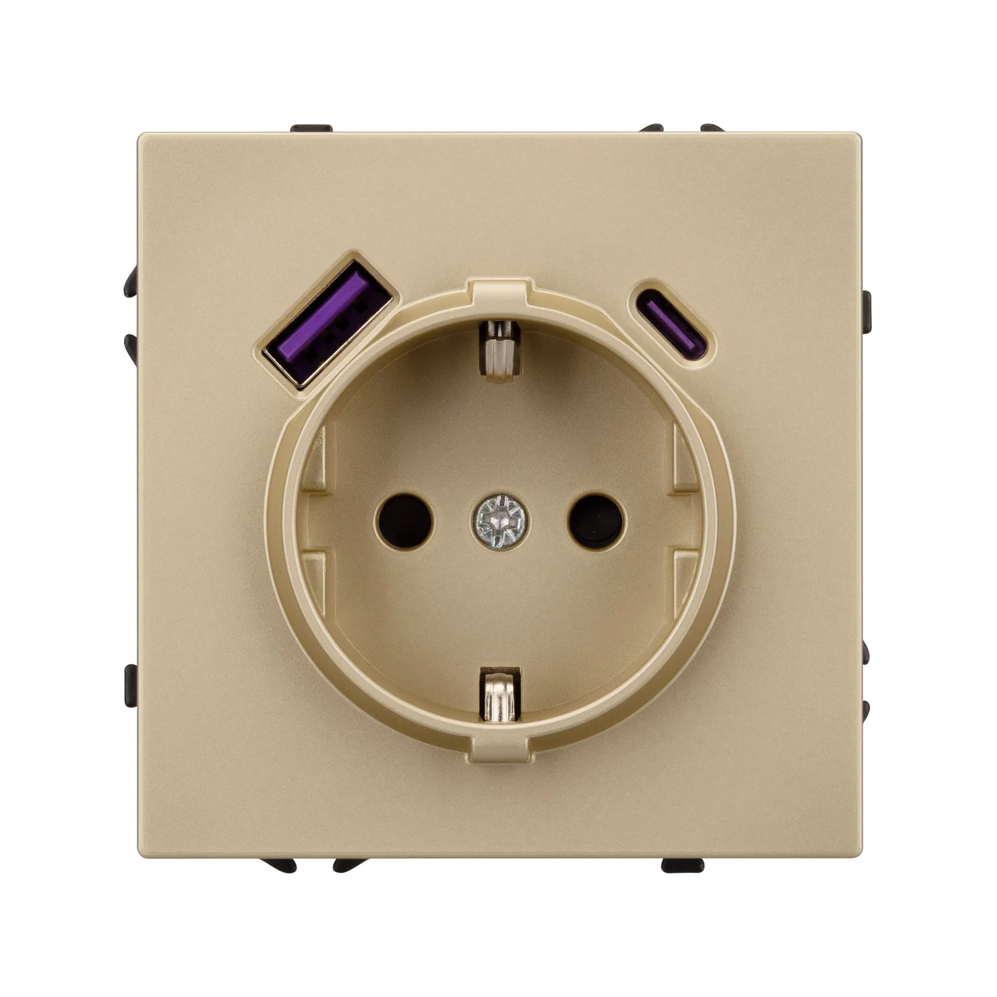 Механизм розетки с заземлением 1 пост и 2 USB Type A+C порта. Цвет - золотой, с Soft-Touch покрытием. Без фронтальной рамки. Уровень пылевлагозащиты IP20. Розетка устанавливается в стандартный подрозетник круглого сечения диаметром 60мм.