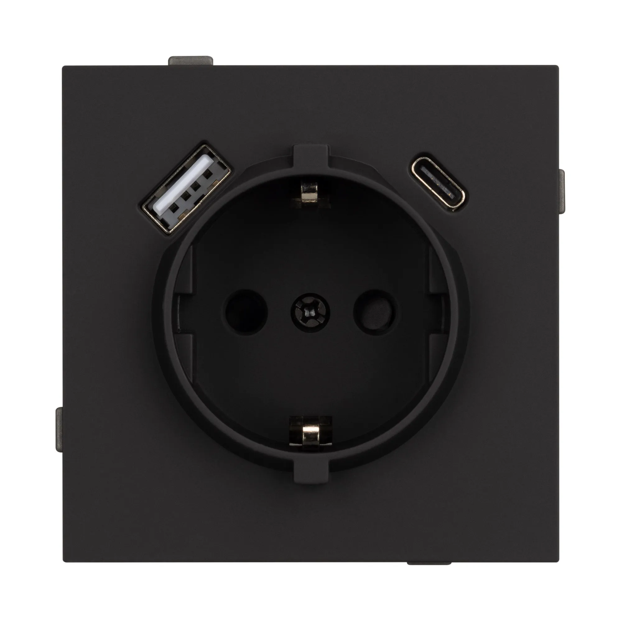 Механизм розетки с заземлением 1 пост 2 USB Type A+C порта. Цвет - черный, с Soft-Touch покрытием. Без фронтальной рамки. Уровень пылевлагозащиты IP20. Розетка устанавливается в стандартный подрозетник круглого сечения диаметром 60мм.
