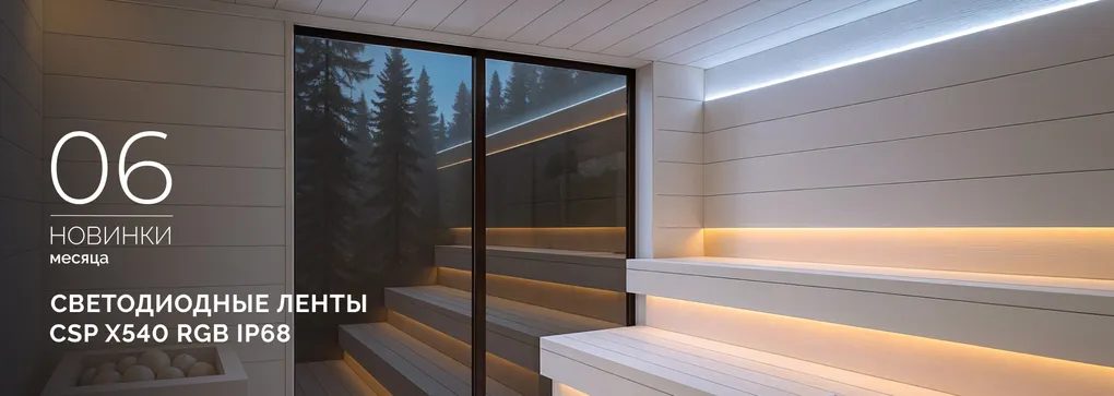 Светодиодная герметичная лента CSP RGB X540 24V со степенью защиты IP68 — это прекрасное решение для подсветки саун, бань, бассейнов, фонтанов и искусственных водоемов (без примесей агрессивных веществ: кислот, щелочей и пр.) на глубине до 2 м.